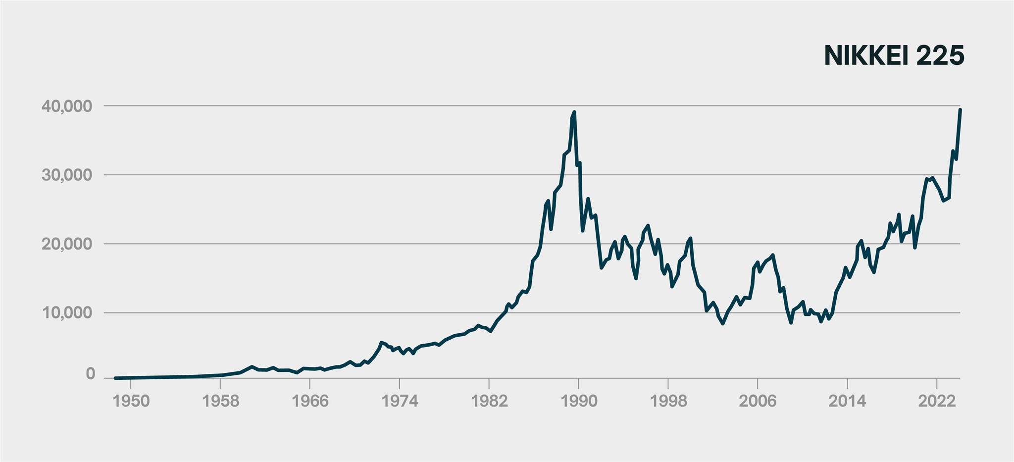 僅在2013年,日經225的價值就增加了超過50%。在接下來的十年裡,它會繼續攀升,只有沿途有少數的挫折。到2023年,該指數在年底收盤時高出28%,並接近其前歷史最高點的觸及範圍。在2024年不到兩個月的時間,就在2月22日,它完全實現了這一目標。