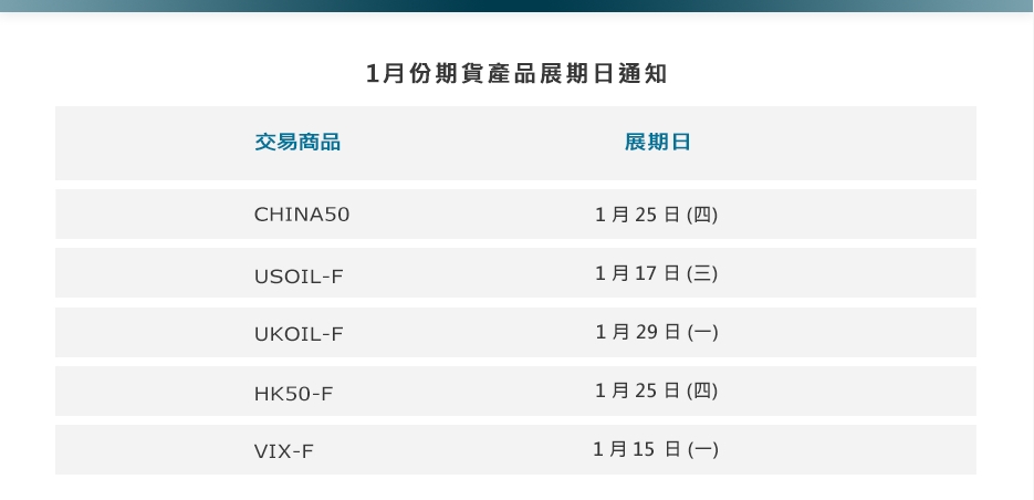 瑞德克斯提醒你,以下產品CHINA50、 USOil-F、 UKOIL-F、 HK50-F、 VIX-F即將展期。