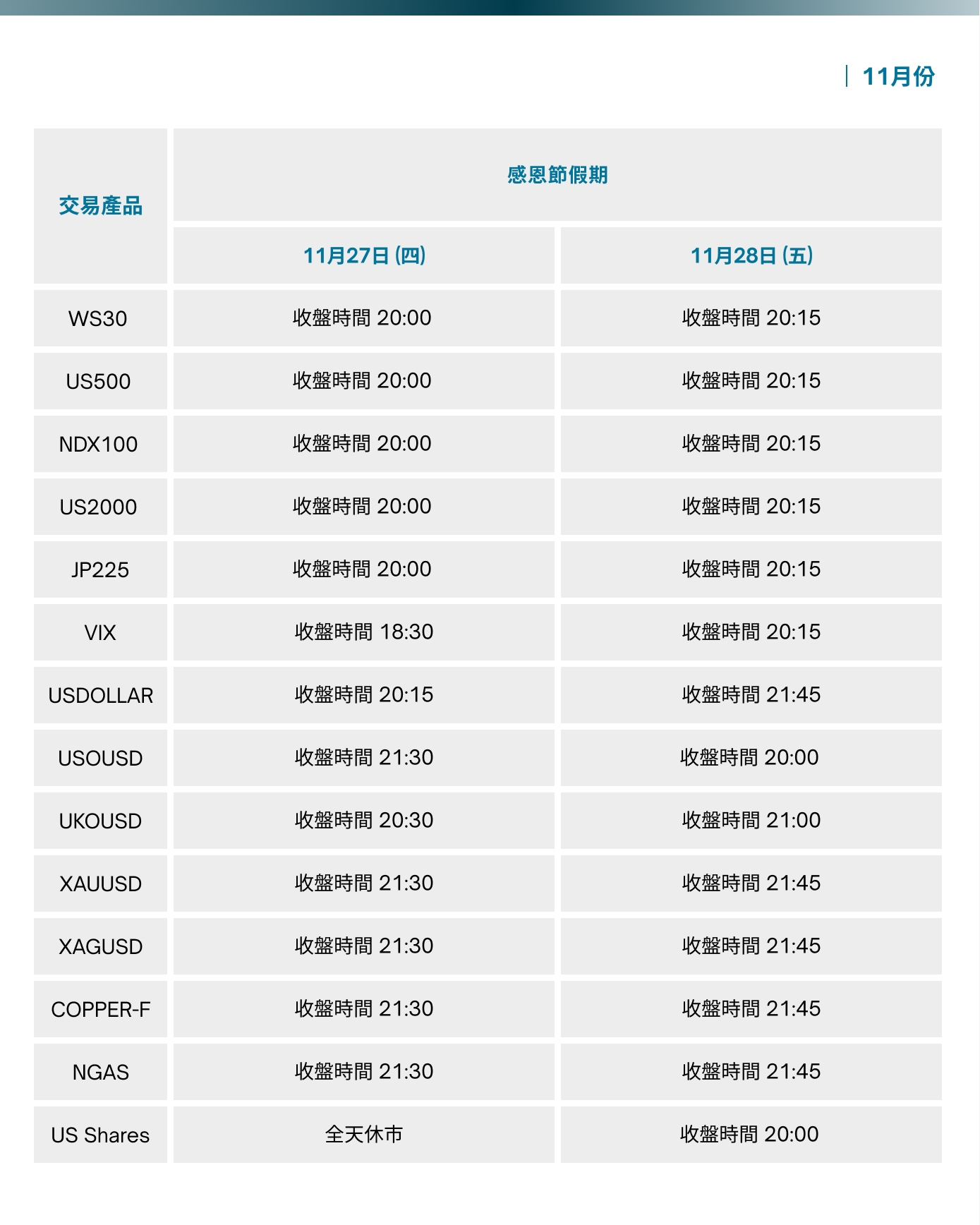 瑞德克斯提醒你,由於適逢2025年 11月連續假期,以下商品的交易時間會有所調整: