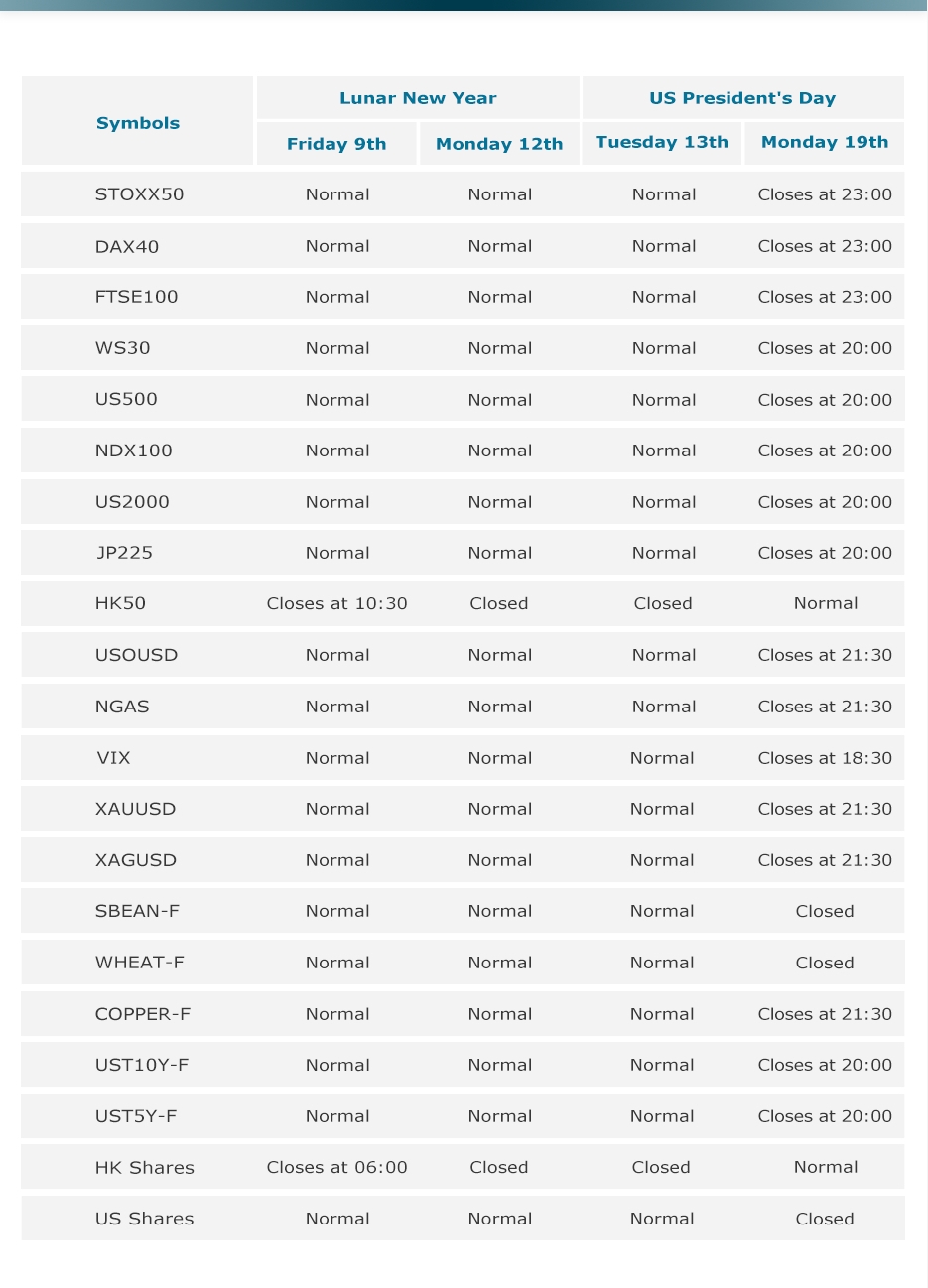Please note that on Lunar New Year and US President's Day in February 2024,