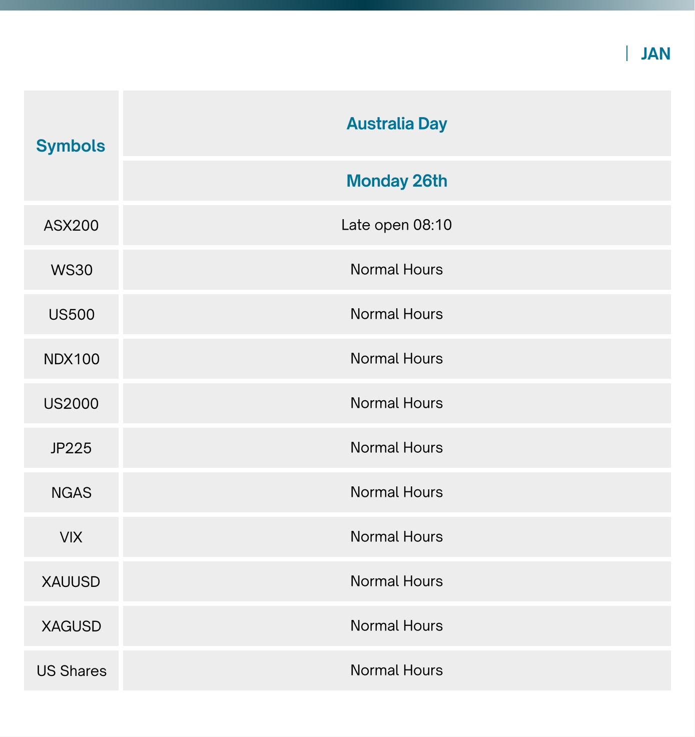 Please note that on the upcoming holidays in January 2026, trading hours for the following products will be affected.