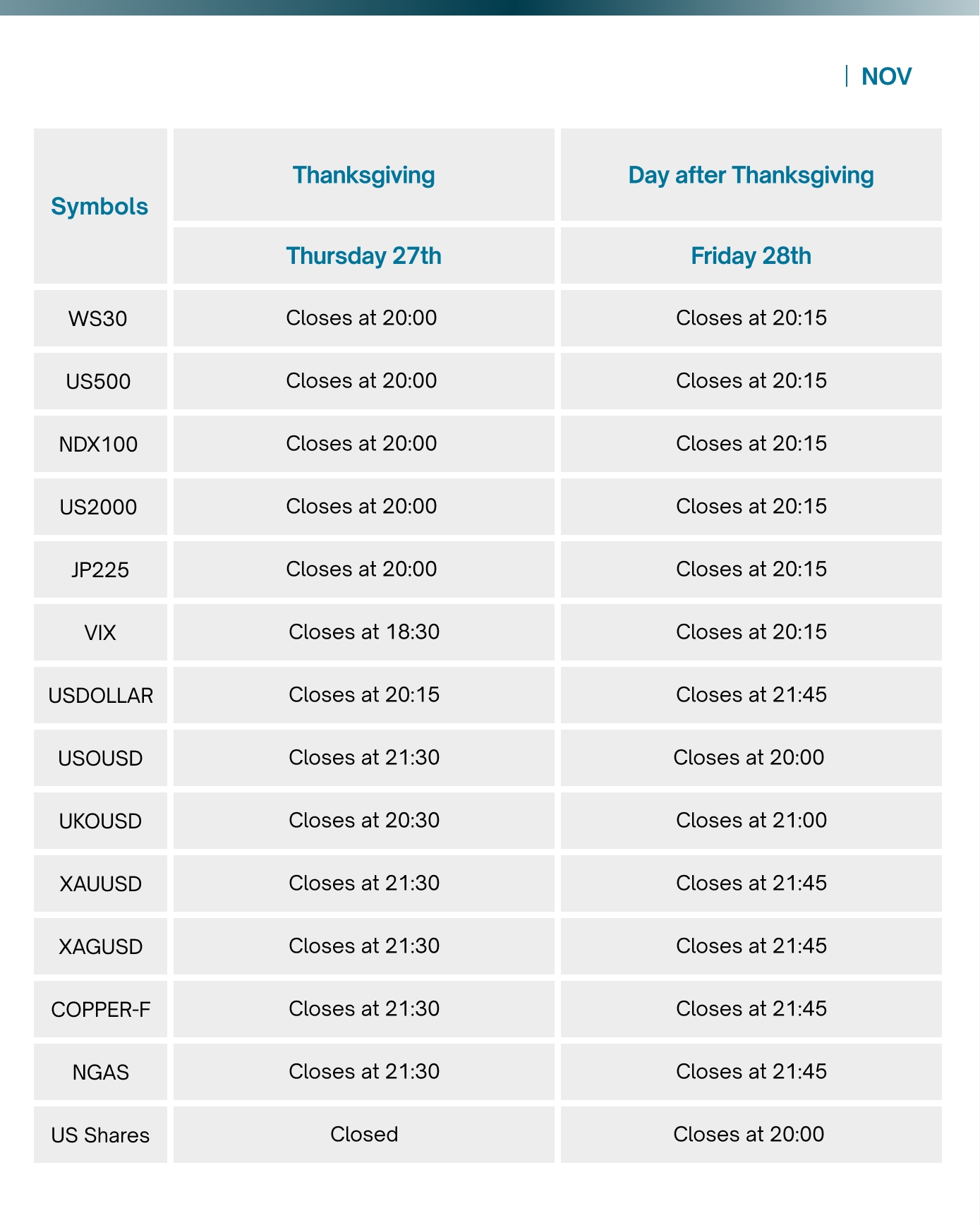 Please note that on the upcoming holidays in November 2025, trading hours for the following products will be affected.