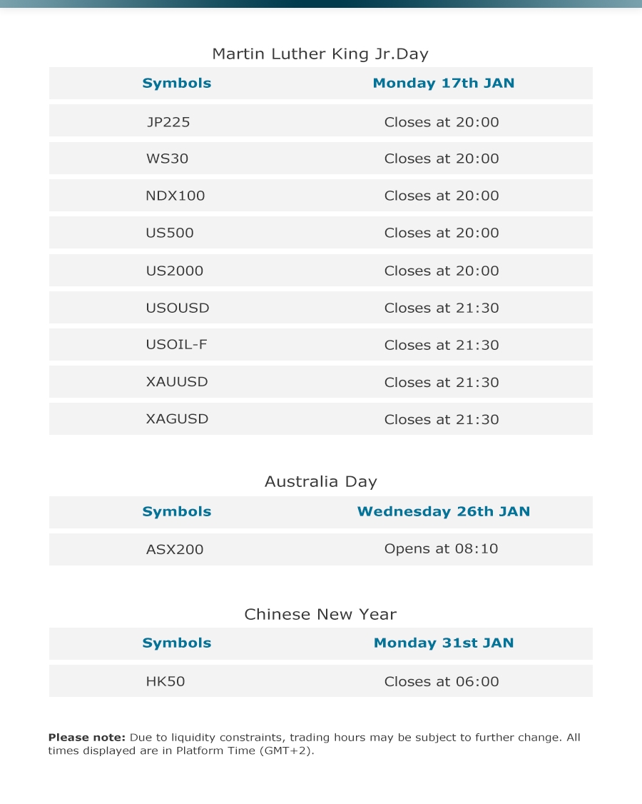 Please note that on Martin Luther King Jr. Day, Australia Day and Chinese New Year in January 2022, trading hours for the following products will be affected.
